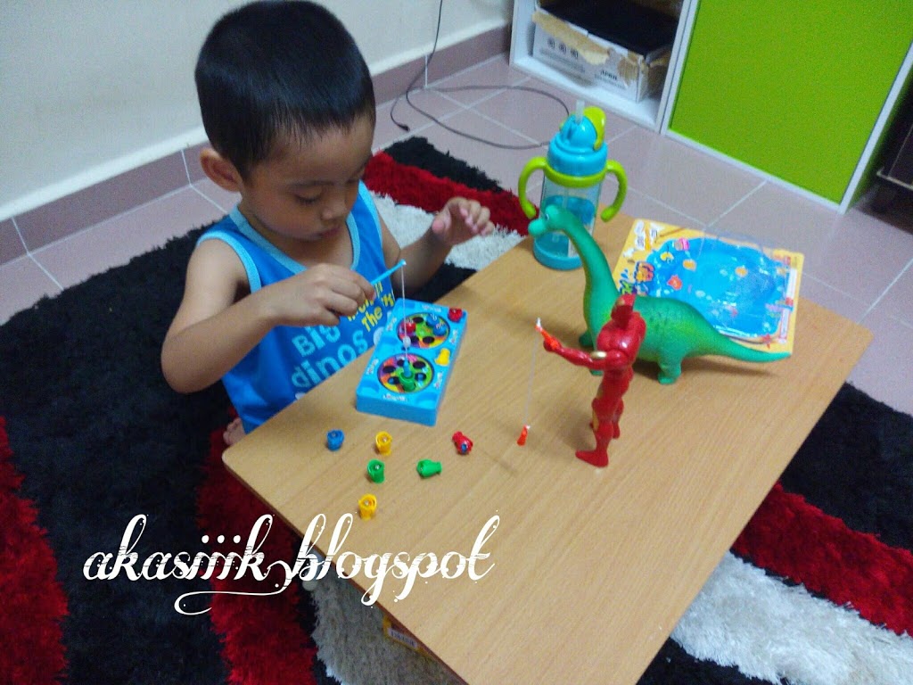 Jadi saya buka mainan pancing ikan dulu. Bagusnya yang Daiso punya ni sebab tak pakai bateri. Dia pakai pusing manual. Wafiy pun seronok nak pusing benda tu. Banyak interaksi boleh dibuat bila main permainan ni. Mengenal warna, ketangkasan dan juga fokus.